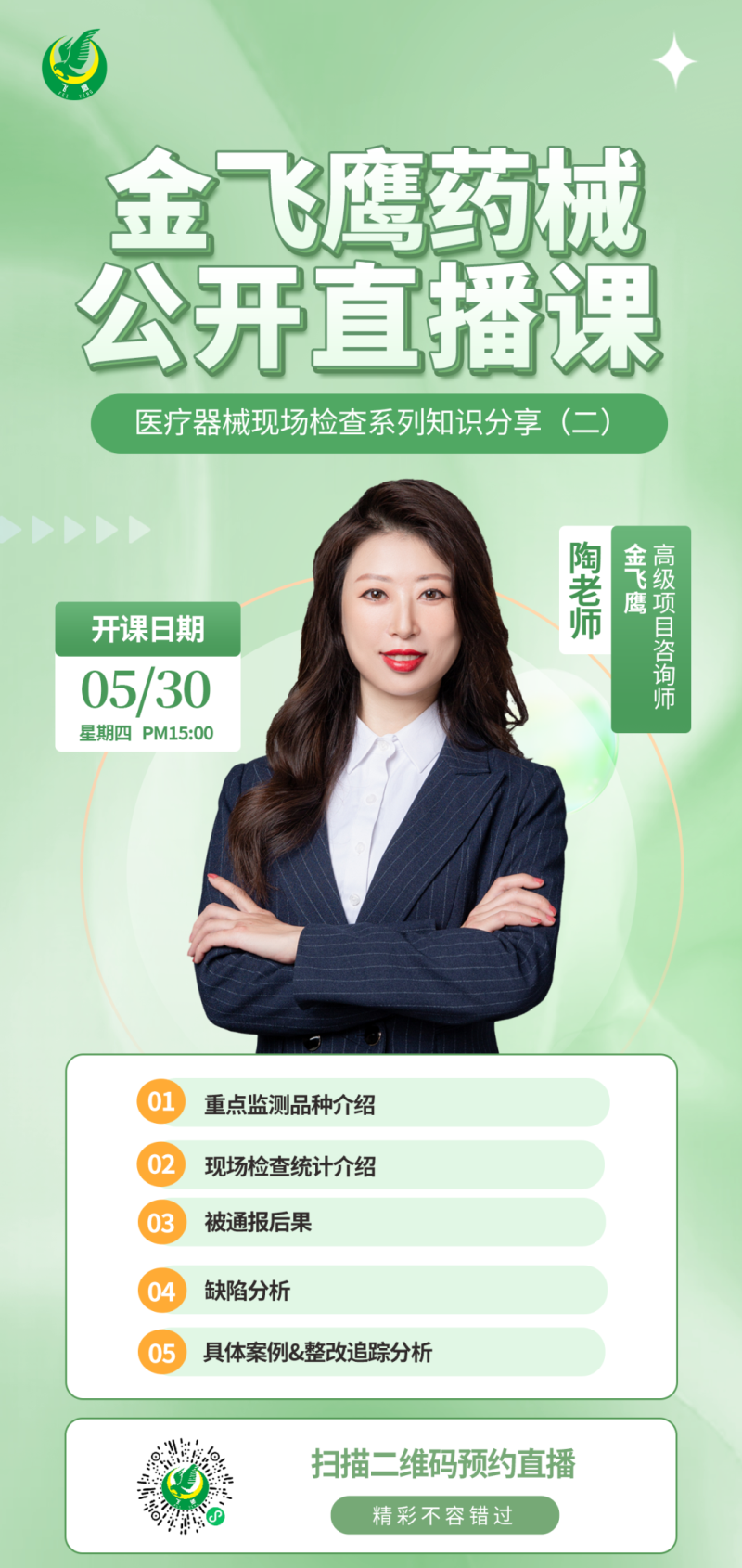 這里提到的體系核查,既有現場檢查,也有資料審查,無疑,現場檢查是更嚴格的一種檢查。根據金飛鷹豐富的現場檢查輔導經驗,結合很多客戶的實際需求,我們策劃了本次線上培訓主題——醫療器械現場檢查系列知識分享,以指導更多新老客戶從容應對現場檢查。