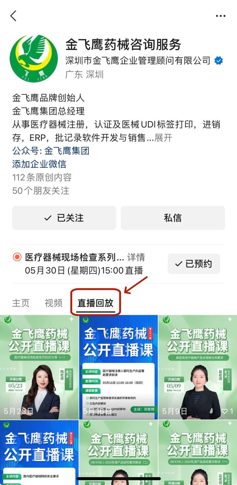 往期直播培訓課程支持回放,關注“金飛鷹藥械咨詢服務”視頻號并點擊視頻號主頁,即可查看“直播回放”哦~