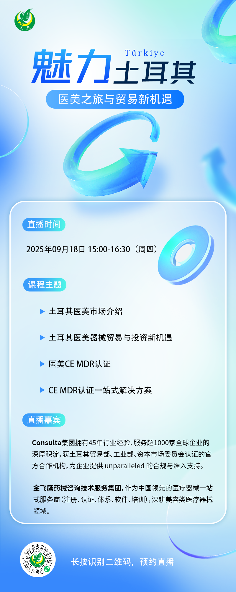 2025年9月18日(周四)下午15:00,金飛鷹藥械咨詢技術服務集團將攜手土耳其Natural Clinic、Consulta Group、Investo Global等多家戰略合作伙伴,聯合舉辦“魅力土耳其:雙軌掘金——醫美之旅與貿易新機遇”線上分享交流會,為您全面揭開土耳其市場的無限潛力!